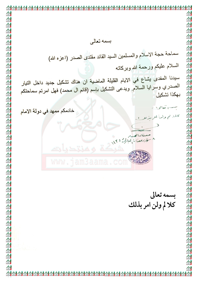 تداول اخبار كاذبة بتشكيل جديد بإسم (قائم آل محمد) استفتاء السيد القائد مقتدى الصدر اعزه الله 25 - 6 - 2015