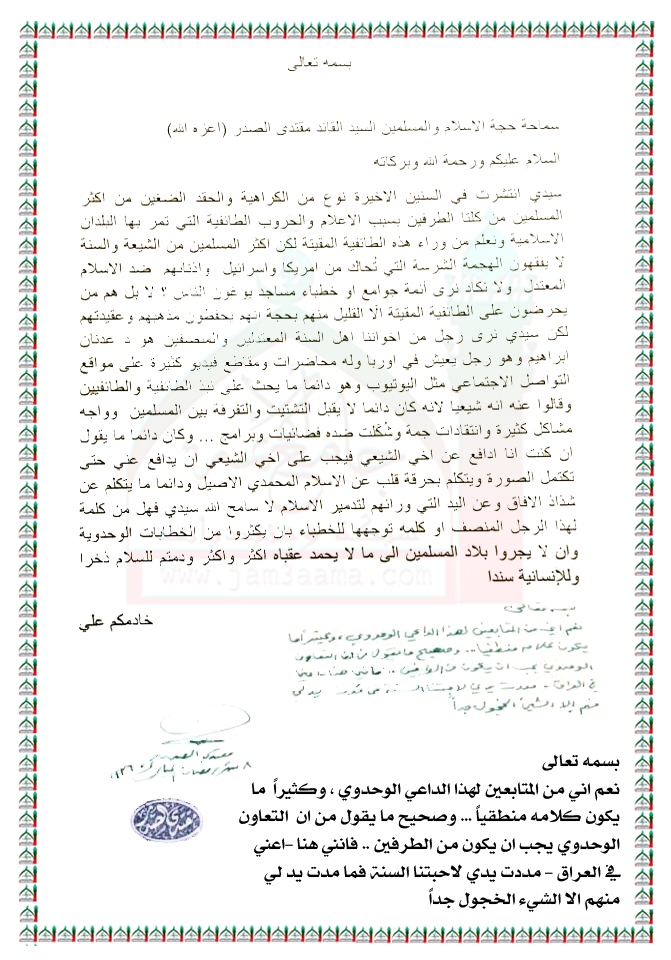 الدكتور عدنان ابراهيم ومواقفه النابذة للطائفية والطائفيين استفتاء سماحة السيد القائد مقتدى الصدر ( اعزه الله ) 25 - 6 - 2015