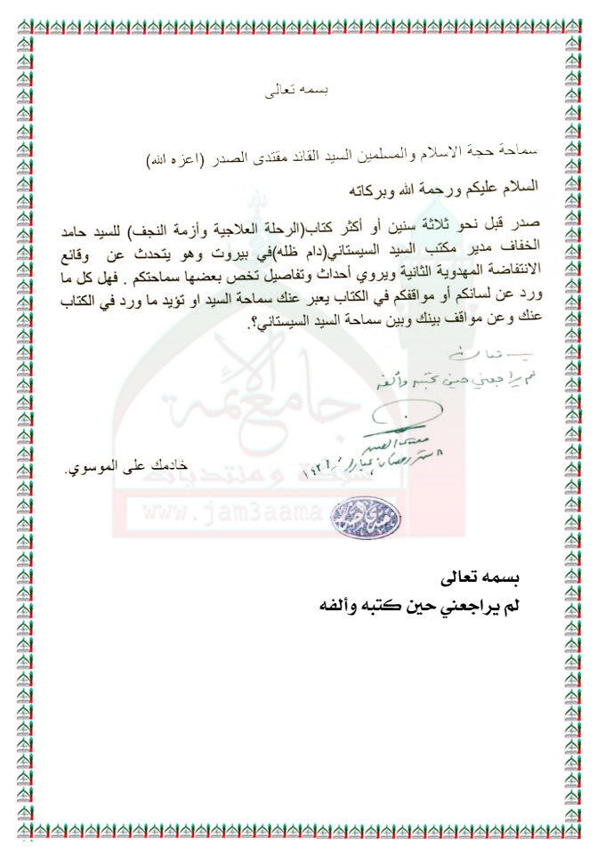 ما ورد في كتاب (الرحلة العلاجية وأزمة النجف) للسيد حامد الخفاف مدير مكتب السيد السيستاني استفتاء سماحة السيد القائد مقتدى الصدر ( اعزه الله ) 25 - 6 - 2015