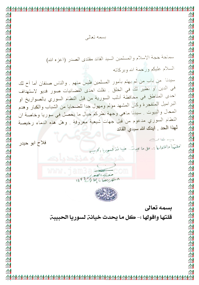 بخصوص ما يحصل في سوريا استفتاء سماحة السيد القائد مقتدى الصدر ( اعزه الله ) 25 - 6 - 2015
