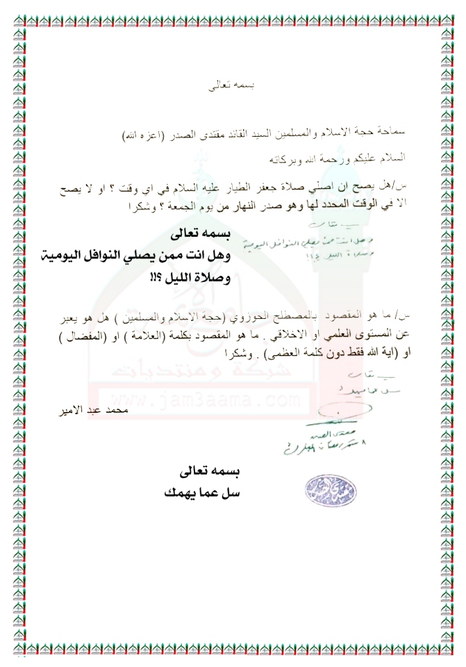 صلاة جعفر الطيار ومعنى بعض المصطلحات الحوزوية استفتاء سماحة السيد القائد مقتدى الصدر ( اعزه الله ) 25 - 6 - 2015