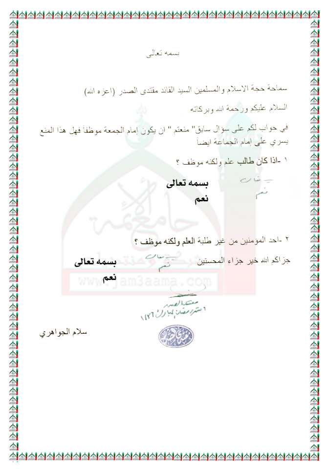 سريان المنع لإمام الجماعة والجمعة الموظف سواء كان من طلبة العلم أو لا استفتاء سماحة السيد القائد مقتدى الصدر ( اعزه الله ) 26- 6 - 2015