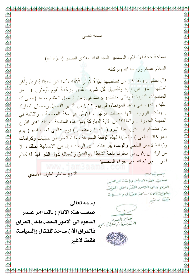 جعل يوم من شهر رمضان المبارك يحمل اسم (يوم المؤاخاة العالمي) استفتاء سماحة السيد القائد مقتدى الصدر ( اعزه الله ) 26- 6 - 2015