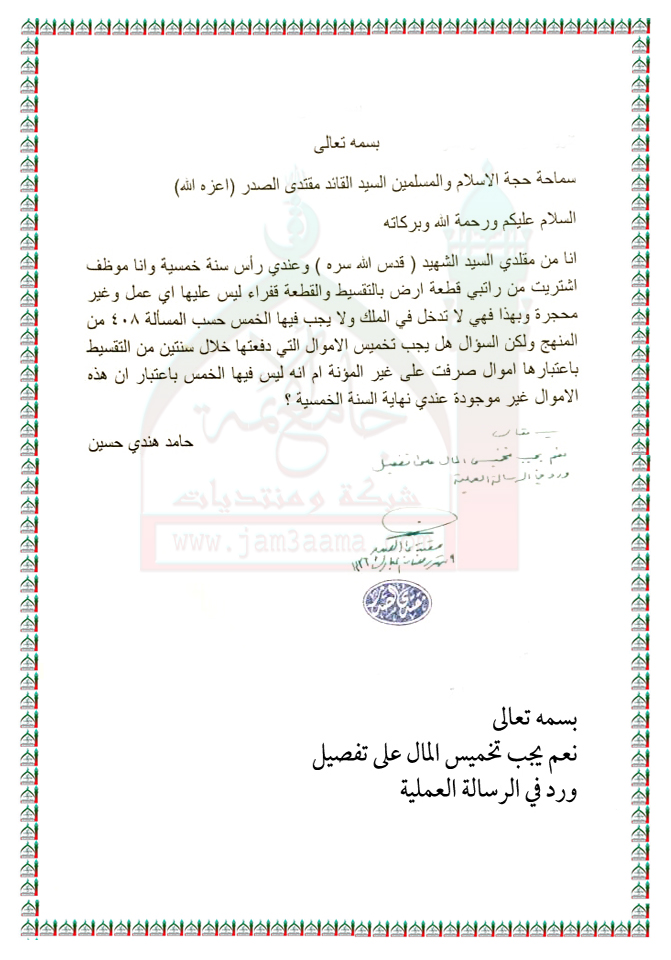 مسالة في الخمس استفتاء السيد القائد مقتدى الصدر اعزه الله 26 - 6 - 2015