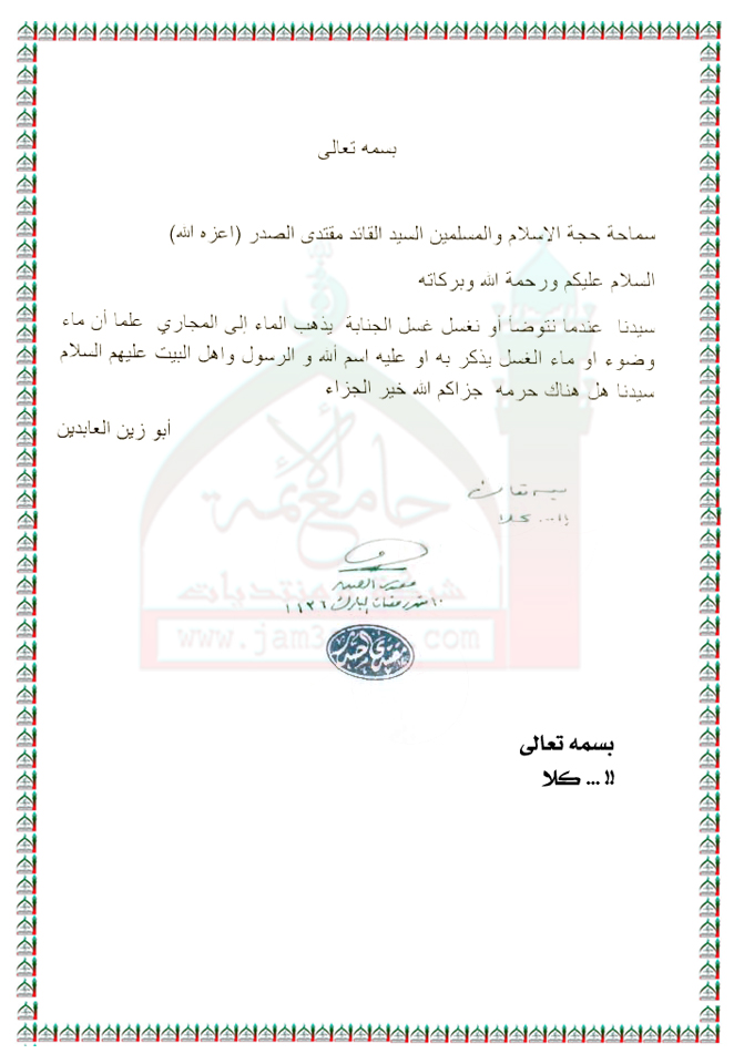 الماء المستخدم في الوضوء وغسل الجنابة استفتاء سماحة السيد القائد مقتدى الصدر ( اعزه الله ) 27- 6 - 2015