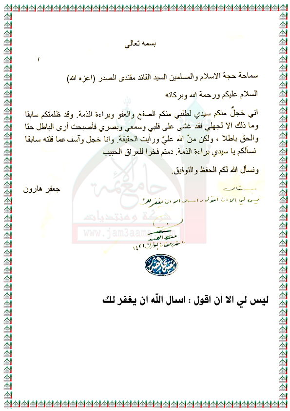 سائل يطلب العفو وبراءة الذمة من سماحته استفتاء سماحة السيد القائد مقتدى الصدر (اعزه الله) 27 - 6 - 2015