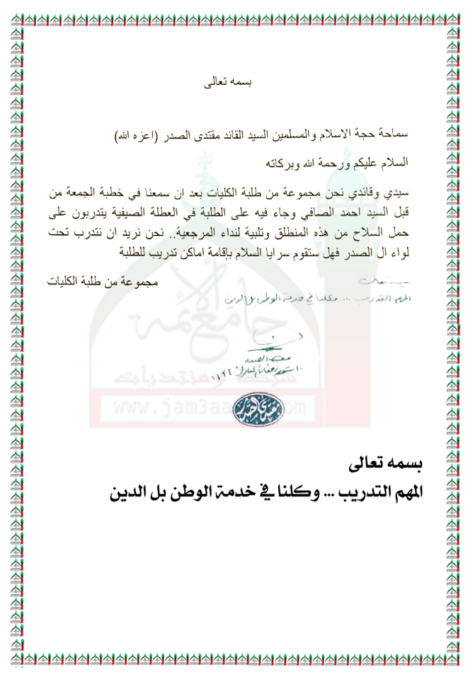 التدريب على حمل السلاح من قبل طلبة الكليات استفتاء سماحة السيد القائد مقتدى الصدر ( اعزه الله ) 27- 6 - 2015