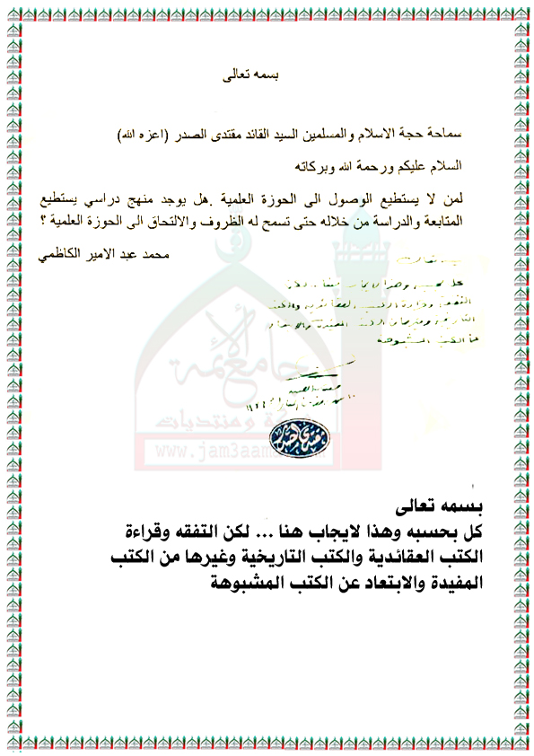 هل من وجود منهج دراسي لمن لا يستطيع الالتحاق بالحوزة العلمية استفتاء سماحة السيد القائد مقتدى الصدر (اعزه الله) 27 - 6 - 2015
