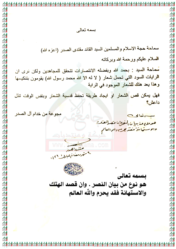 تنكيس الرايات السوداء التي تحمل شعار (لا اله الا الله محمد رسول الله) استفتاء سماحة السيد القائد مقتدى الصدر (اعزه الله) 27 - 6 - 2015