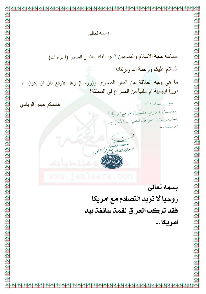 العلاقة مع روسيا ودورها في الصراع الدائر في المنطقة استفتاء سماحة السيد القائد مقتدى الصدر ( اعزه الله ) 27- 6 - 2015