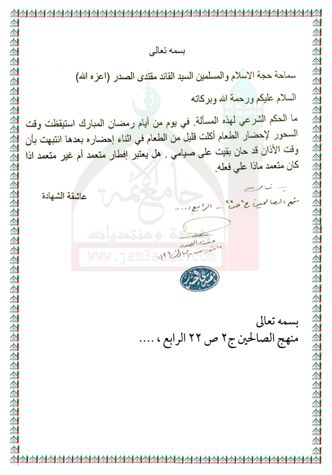 الصائمون وتناول الطعام دون العلم بحلول موعد أذان الفجر استفتاء السيد القائد مقتدى الصدر اعزه الله 29 - 6 - 2015
