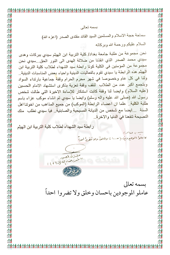 قيام رابطة سيد الشهداء لطلاب كلية التربية ابن الهيثم بفعاليات دينية استفتاء السيد القائد مقتدى الصدر اعزه الله 29 - 6 - 2015