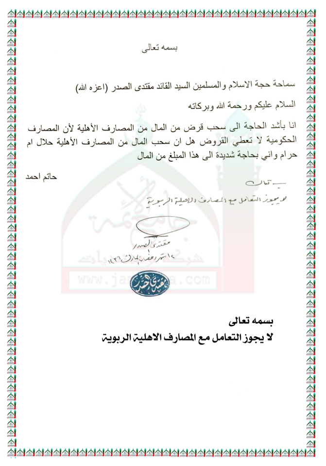 التعامل مع المصارف الأهلية استفتاء سماحة السيد القائد مقتدى الصدر ( اعزه الله ) 29- 6 - 2015