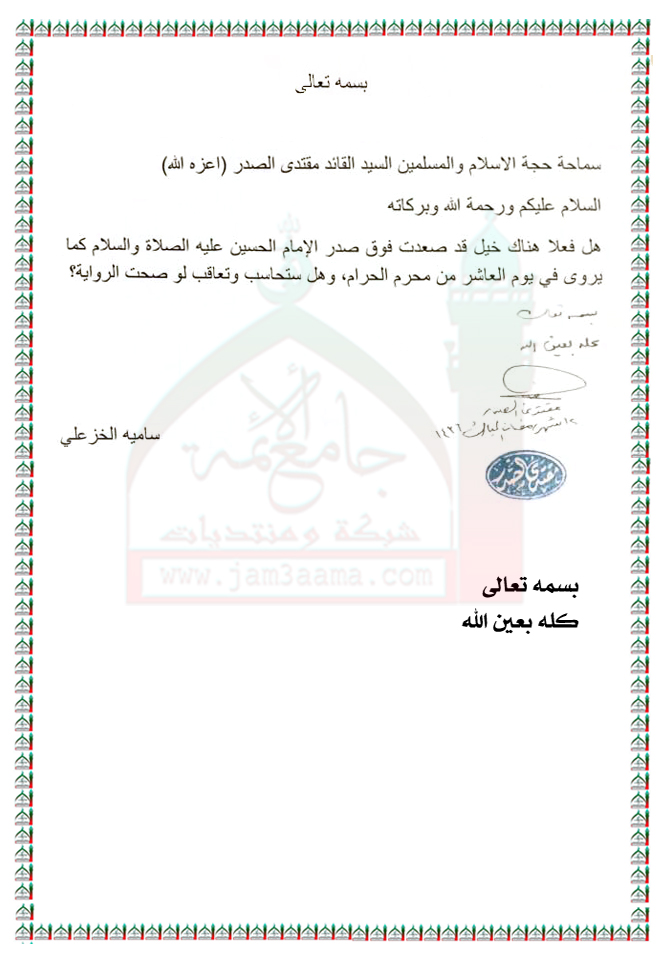 صعود الخيل على صدر الإمام الحسين (عليه السلام) في واقعة الطف استفتاء سماحة السيد القائد مقتدى الصدر ( اعزه الله ) 29- 6 - 2015