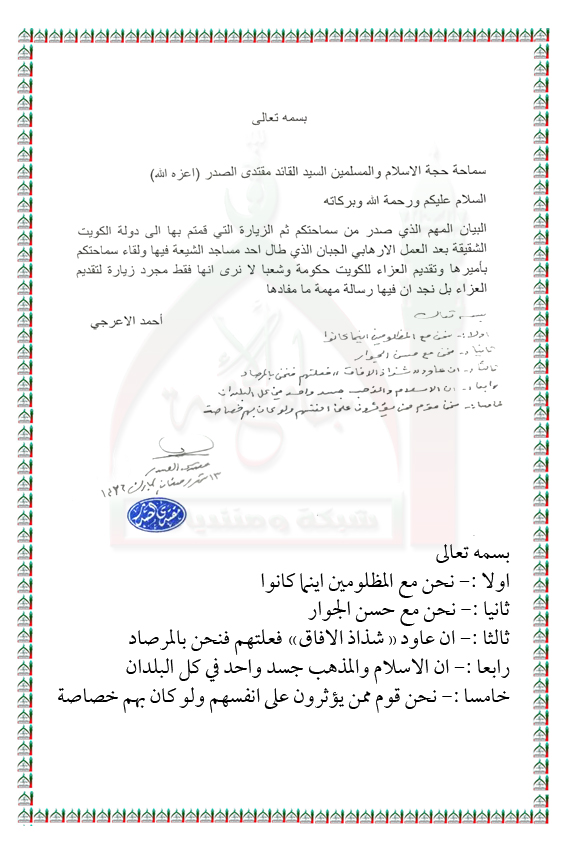 زيارة سماحته لدولة الكويت الشقيقة وما تحمله من رسائل استفتاء السيد القائد مقتدى الصدر اعزه الله 30 - 6 - 2015