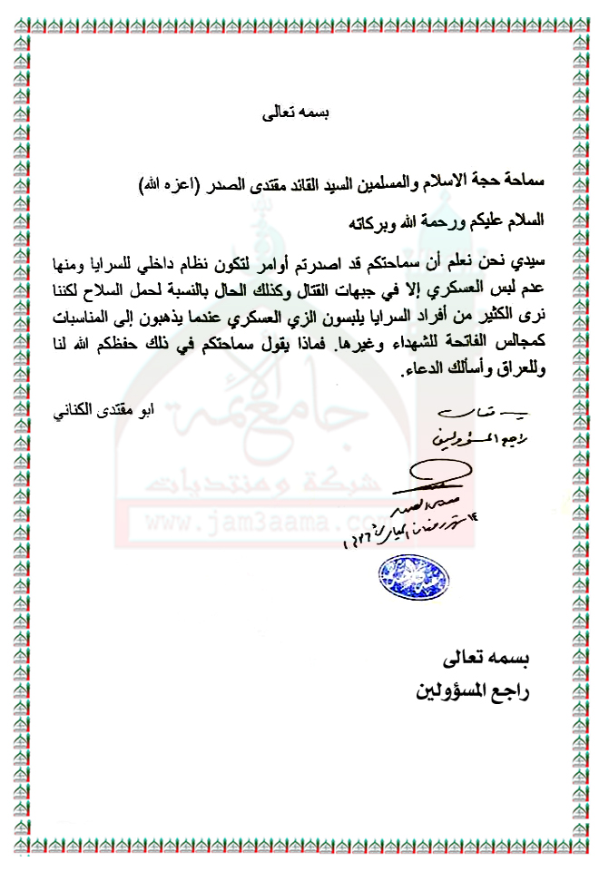 ارتداء بعض افراد سرايا السلام الملابس العسكرية في غير جبهات القتال استفتاء سماحة السيد القائد مقتدى الصدر ( اعزه الله ) 1- 7 - 2015