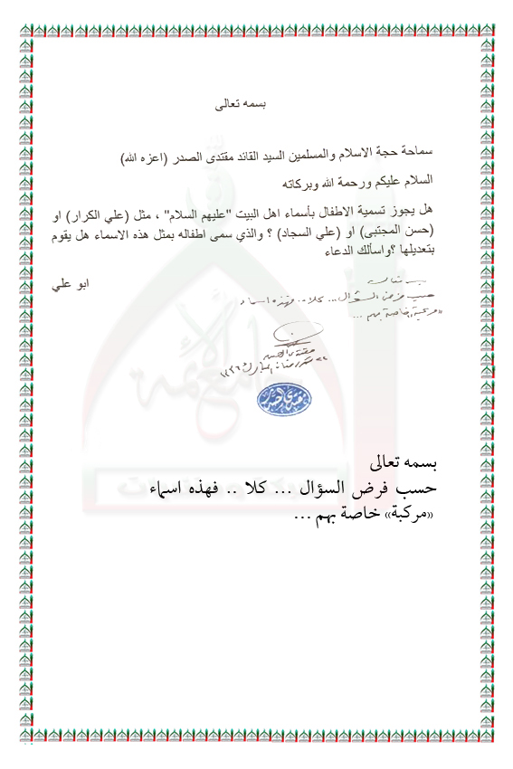تسمية الأطفال بالأسماء المركبة الخاصة بأهل البيت عليهم السلام استفتاء السيد القائد مقتدى الصدر اعزه الله 9 - 7 - 2015