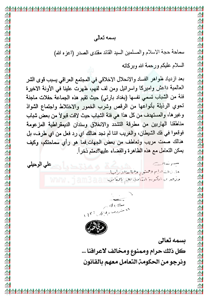 ظواهر الفساد والانحلال الأخلاقي في المجتمع استفتاء سماحة السيد القائد مقتدى الصدر ( اعزه الله ) 13 - 7 - 2015