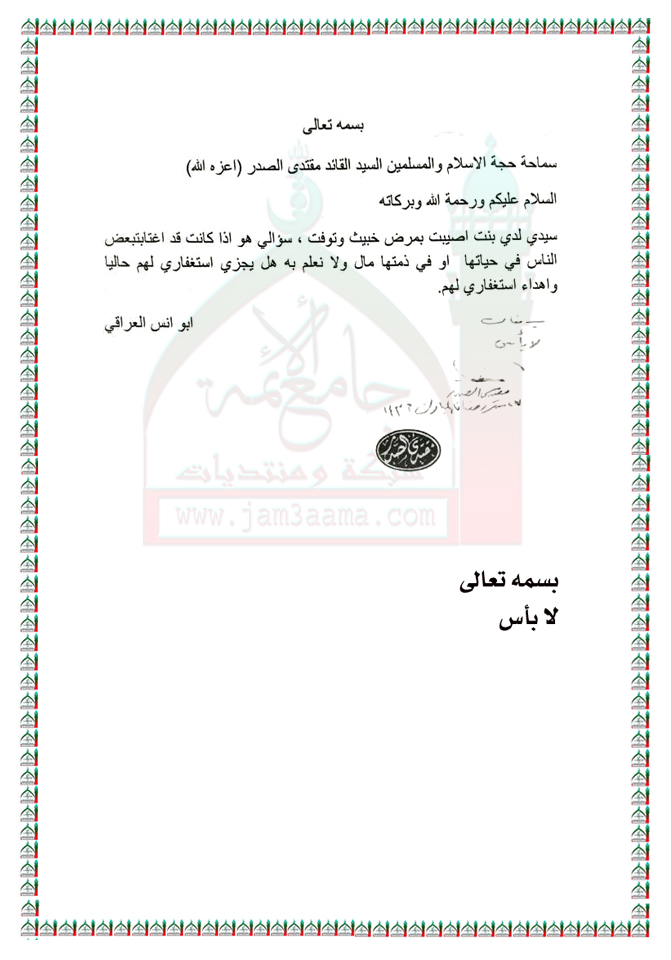 الاستغفار عن الغيبة للبنت المتوفاة استفتاء السيد القائد مقتدى الصدر اعزه الله 14 - 7 - 2015