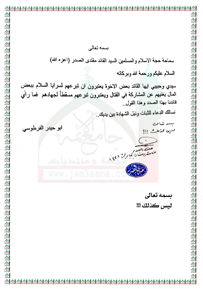 بعض من يعتقدون ان التبرع بالمال لسرايا السلام يغنيهم عن المشاركة في القتال استفتاء سماحة السيد القائد مقتدى الصدر ( اعزه الله ) 14 - 7 - 2015