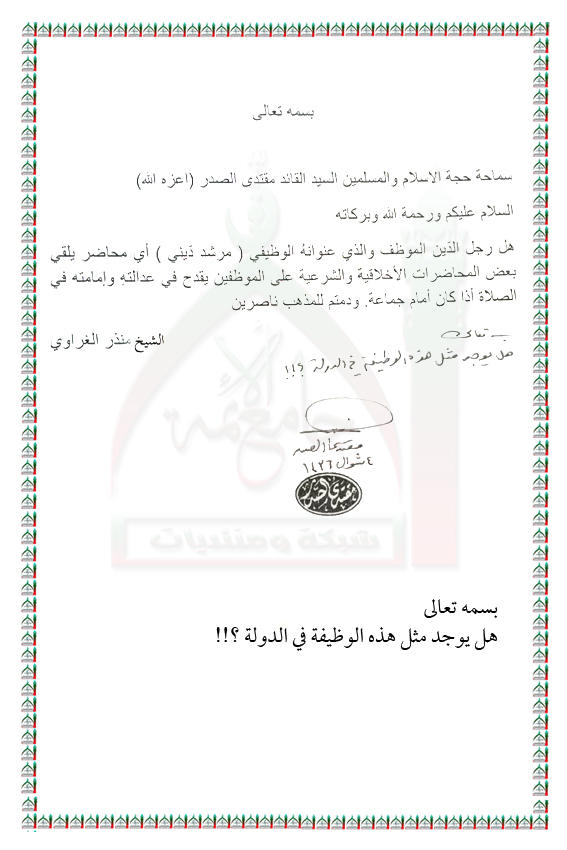 عمل رجل الدين كموظف حكومي تحت عنوان مرشد ديني استفتاء السيد القائد مقتدى الصدر اعزه الله 21 - 7 - 2015