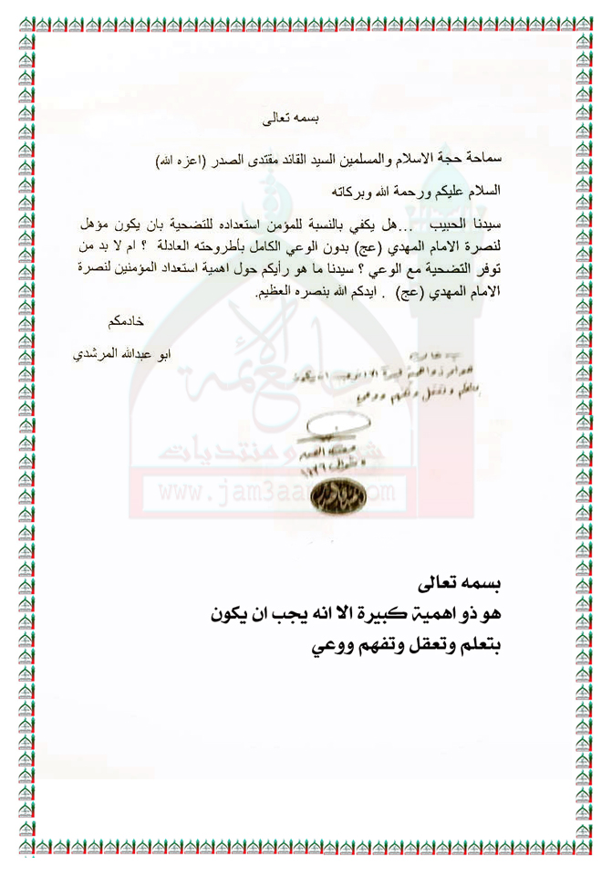 أهمية الاستعداد من قبل المؤمنين لنصرة الإمام المهدي (عجل الله فرجه) استفتاء السيد القائد مقتدى الصدر اعزه الله 22 - 7 - 2015