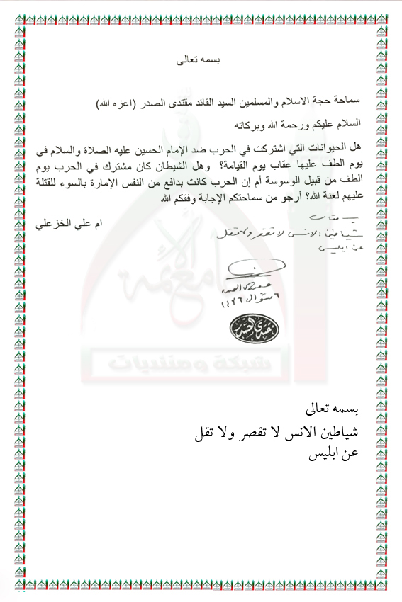 الحيوانات التي اشتركت في واقعة الطف ضد الإمام الحسين عليه السلام استفتاء السيد القائد مقتدى الصدر اعزه الله 23 - 7 - 2015