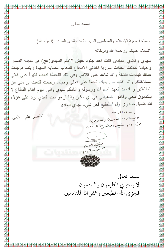أحد الأشخاص يعلن براءته من المنشقين استفتاء السيد القائد مقتدى الصدر اعزه الله 23 - 7 - 2015
