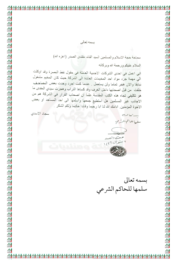 احد العاملين في احدى الشركات الاجنبية والتصرف بالمصاحف الشريفة بعد تركها من قبل العاملين في تلك الشركة استفتاء السيد القائد مقتدى الصدر اعزه الله 24 - 7 - 2015
