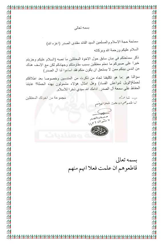 تكليف المعتقلين في حملة ( الويل لدواعش الفساد ) استفتاء السيد القائد مقتدى الصدر اعزه الله 24 - 7 - 2015