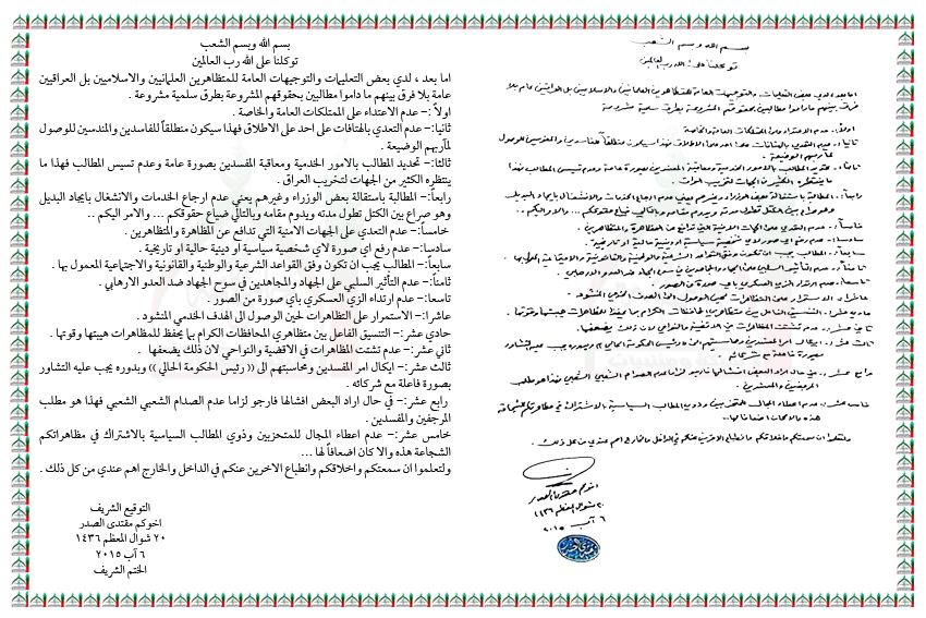 بعض التعليمات والتوجيهات العامة للمتظاهرين العلمانيين والاسلاميين بل العراقيين كافة ما داموا مطالبين بحقوقهم المشروعة بيان السيد القائد مقتدى الصدر اعزه الله 6 - 8 - 2015