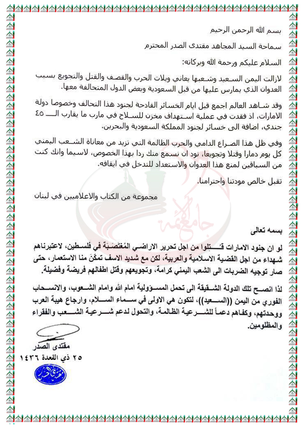 استمرار العدوان الغاشم على اليمن وشعبه المظلوم استفتاء السيد القائد مقتدى الصدر اعزه الله 10 - 9 - 2015