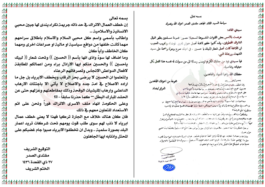 حادثة خطف العمال الاتراك استفتاء السيد القائد مقتدى الصدر اعزه الله 12 - 9 - 2015