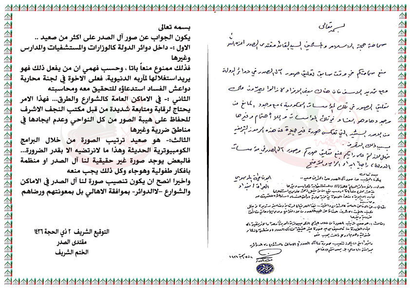 اجاب سماحة السيد القائد مقتدى الصدر (أعزه الله) في استفتاء قدم لسماحته بخصوص وضع صور آل الصدر في الدوائر الحكومية ومنع ذلك منعاً باتاً واشار الى انها تستغل لمآرب دنيوية ونوه الى ضرورة وضع الصور في الشوارع يكون بموافقة الاهالي بل بمعونتهم ورضاهم وشدد على منع التلاعب بالصور من خلال البرامج الكومبيوترية بطريقة طفولية وهوجاء.
