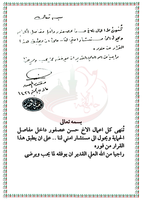 انهاء اعمال الاخ حسن عصفور من مهام الحماية وتحويله الى مستشار امني لسماحته بيان السيد القائد مقتدى الصدر اعزه الله 29- 9 - 2015