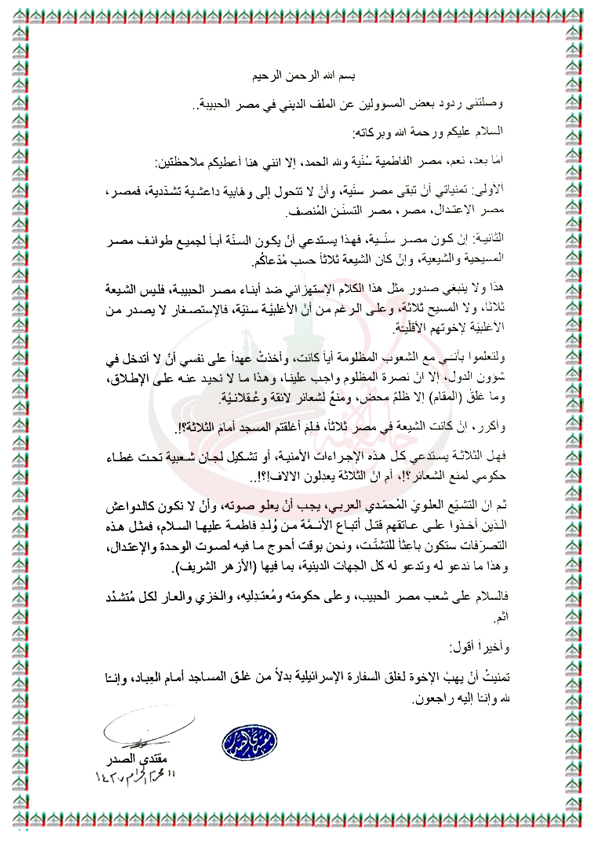 الردود تجاه موقف سماحته لغلق مقام الامام الحسين (عليه السلام) في مصر بيان السيد القائد مقتدى الصدر اعزه الله 25 - 10 - 2015