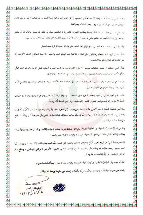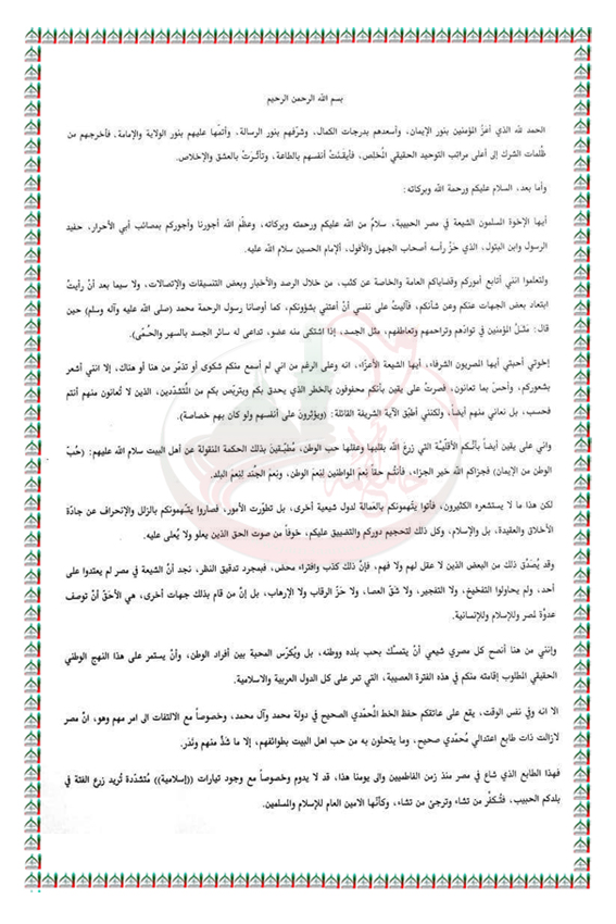 رسالة السيد القائد مقتدى الصدر أعزه الله الى الاخوة شيعة آل البيت (عليهم السلام) في مصر الحبيبة 3 - 11 - 2015