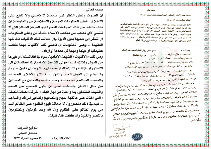 ما يواجهه اتباع أهل البيت عليهم السلام في افغانستان من قتل وظلم واضطهاد على يد الجماعات التكفيرية الضالة استفتاء السيد القائد مقتدى الصدر اعزه الله 12 - 11 - 2015