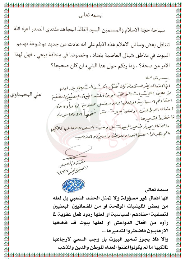 تدمير البيوت في مناطق شمال بغداد وخصوصا في منطقة بيجي استفتاء السيد القائد مقتدى الصدر اعزه الله 20 - 11 - 2015