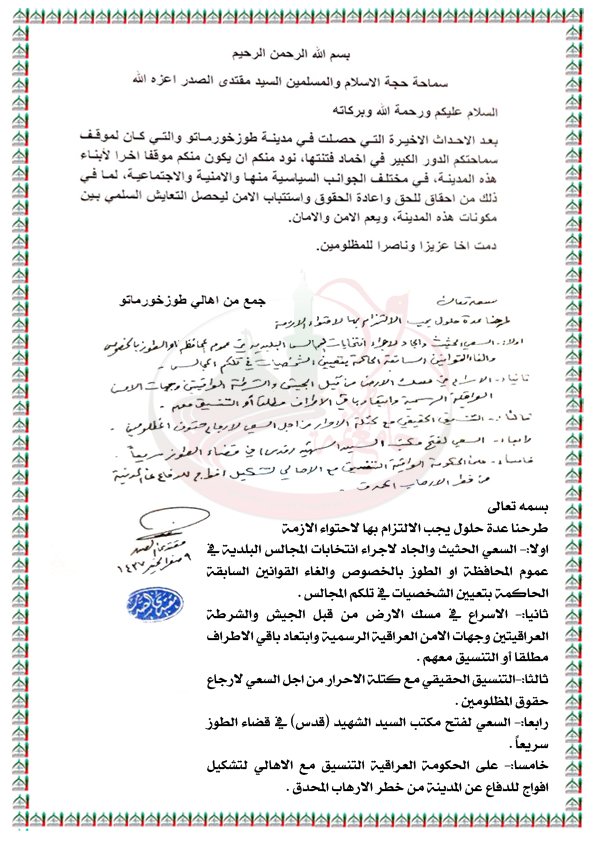 توصيات سماحته لابناء قضاء طوزخورماتو والحكومة العراقية لاحتواء الازمة استفتاء السيد القائد مقتدى الصدر اعزه الله 22 - 11 - 2015