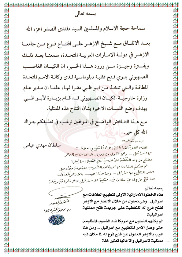 فتح فرع لجامعة الازهر في الامارات وفتح ممثلية صهيونية في الامارات ايضا استفتاء السيد القائد مقتدى الصدر اعزه الله 30 - 11 - 2015