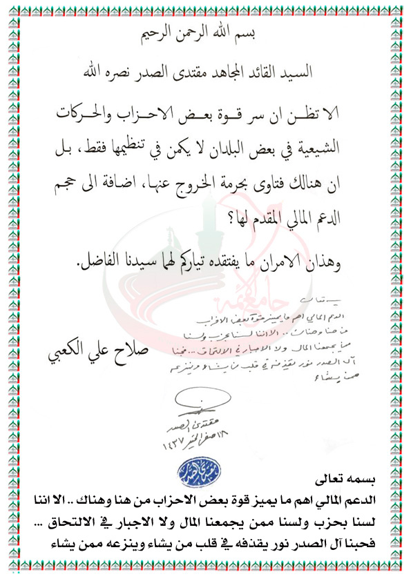 اننا لسنا بحزب ولسنا ممن يجمعنا المال ولا الاجبار في الالتحاق فحبنا آل الصدر نور يقذفه في قلب من يشاء وينزعه ممن يشاء استفتاء السيد القائد مقتدى الصدر اعزه الله 1 - 12 - 2015
