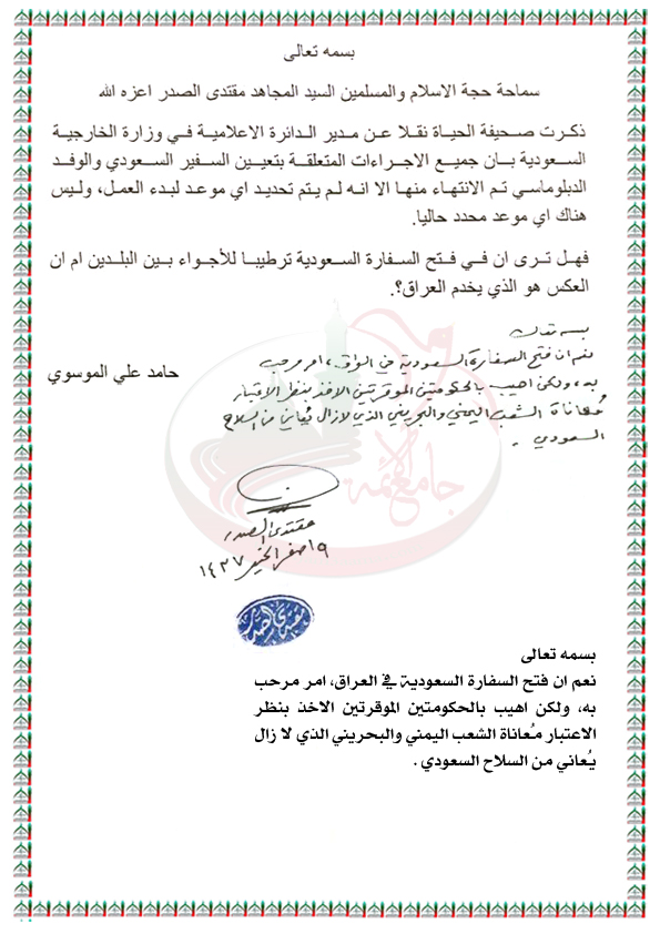 فتح السفارة السعودية في العراق استفتاء السيد القائد مقتدى الصدر اعزه الله 2 - 12 - 2015