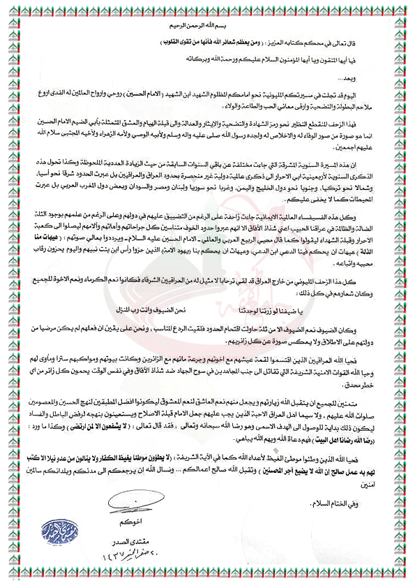 تحية للجموع المليونية المؤمنة التي شاركت بإحياء زيارة الاربعين المباركة بيان السيد القائد مقتدى الصدر اعزه الله 3 - 12 - 2015