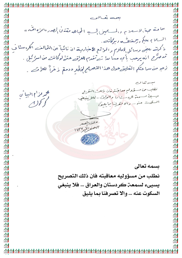 تصريح احد نواب كردستان الذي رحب من خلاله بقبول المساعدات حتى من اسرائيل استفتاء السيد القائد مقتدى الصدر اعزه الله 6 - 12 - 2015