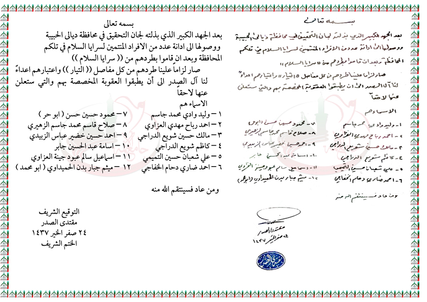 طرد عدد من المدانين من قبل لجنة التحقيق في محافظة ديالى من كافة مفاصل التيار بعدما طردوا من سرايا السلام بيان السيد القائد مقتدى الصدر اعزه الله 7 - 12 - 2015