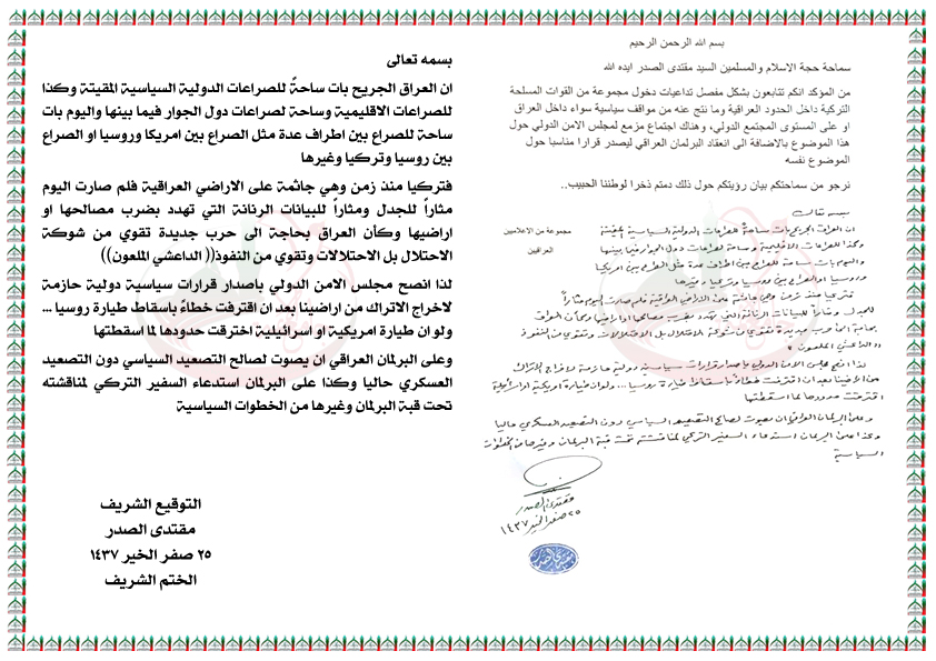 تداعيات دخول القوات المسلحة التركية داخل الحدود العراقية استفتاء السيد القائد مقتدى الصدر اعزه الله 8 - 12 - 2015