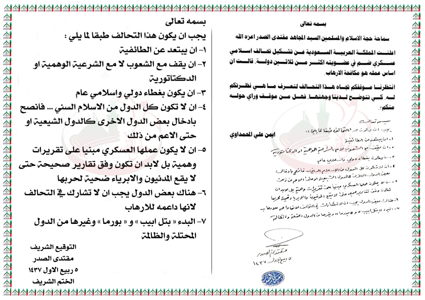 ما أعلنته المملكة العربية السعودية عن تشكيلها لتحالف اسلامي عسكري يضم اكثر من ثلاثين دولة لمحاربة الارهاب استفتاء السيد القائد مقتدى الصدر اعزه الله 18 - 12 - 2015