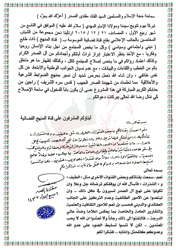 افتتاح قناة المنهج الفضائية ونصائح لقناتي الطيف والشذرات الفضائيتين استفتاء السيد القائد مقتدى الصدر اعزه الله 19 - 12 - 2015