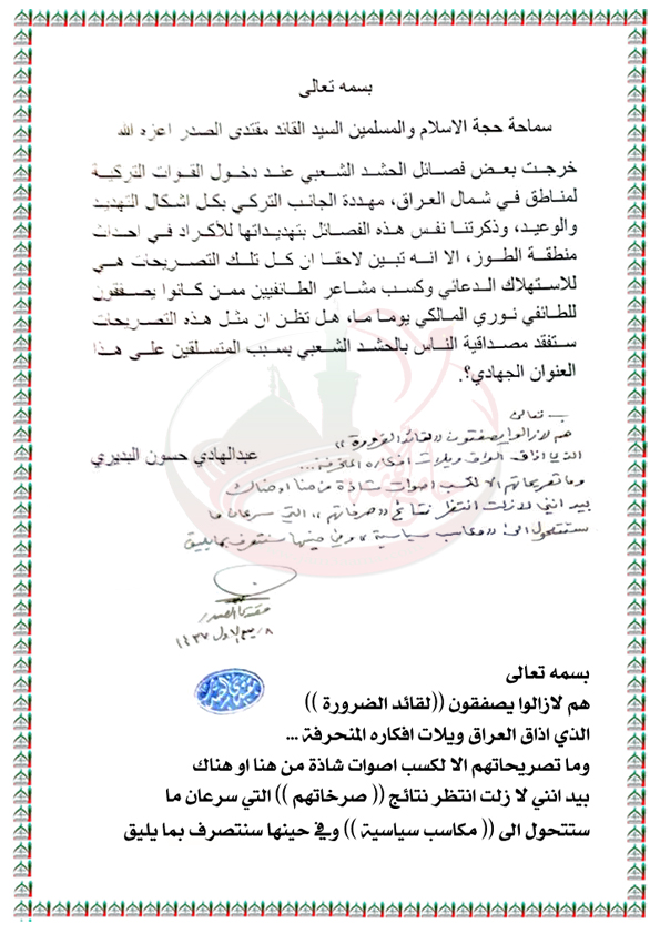 تهديدات بعض فصائل الحشد الشعبي بخصوص الاحداث الاخيرة التي جرت في شمال العراق استفتاء السيد القائد مقتدى الصدر اعزه الله 21 - 12 - 2015